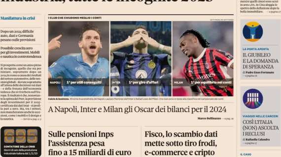 Il Sole 24 Ore oggi in edicola in prima pagina si è concentrato anche sulla Serie A e in particolar modo sui club che hanno chiuso meglio i conti in questo 2024. Gli Oscar dei bilanci sono andati a Napoli, Inter e Milan. Gli azzurri sono risultati primi per utili conseguiti nell’anno che sta per finire mentre l’Inter domina per quanto riguarda il giro d’affari. Il Milan infine è risultato il club italiano con più equilibrio nei conti.