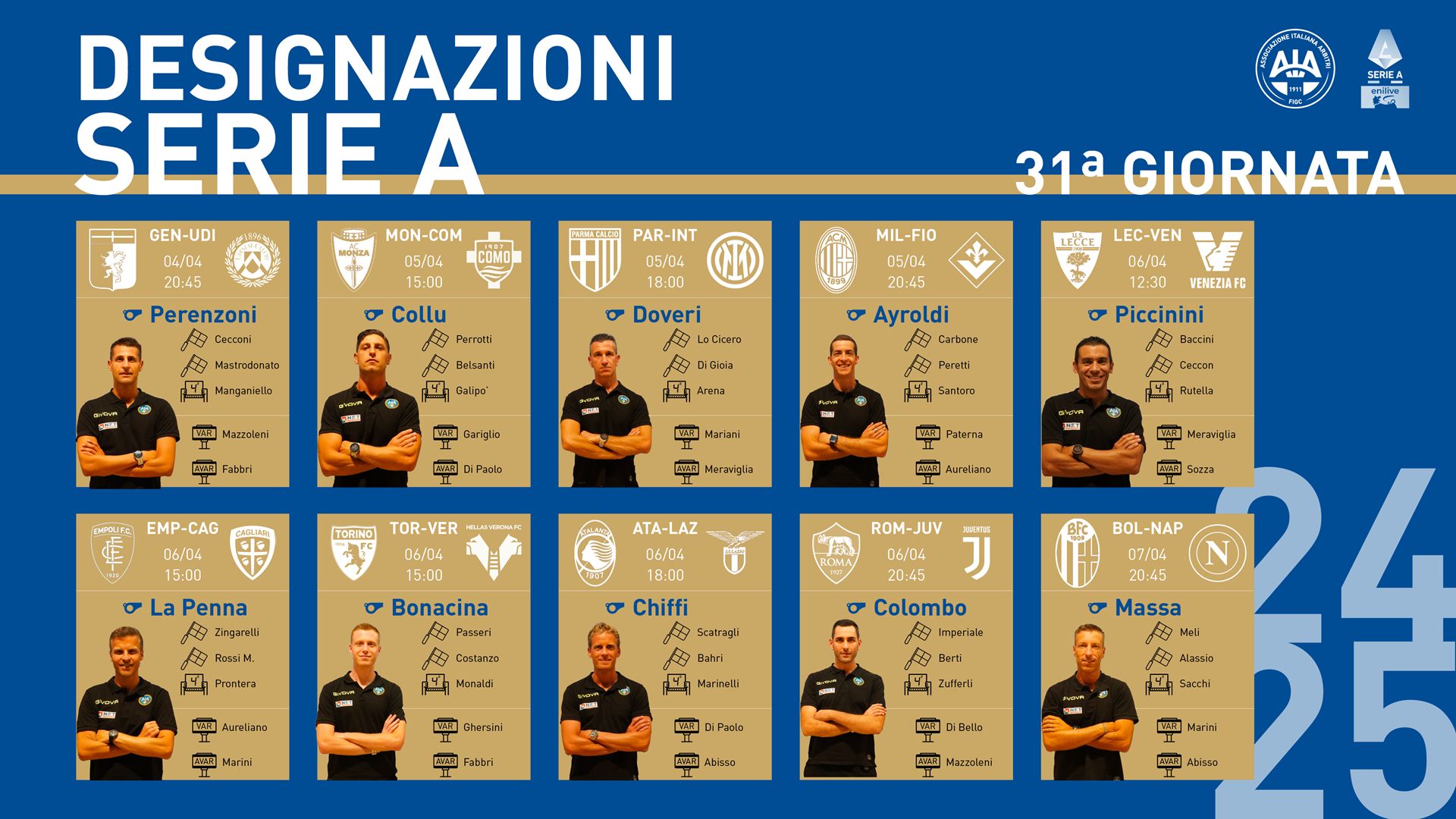 L’AIA ha reso noti i nominativi di arbitri, assistenti, IV Ufficiali, VAR e AVAR che dirigeranno le partite della 31ª giornata del Campionato di Serie A 2024/25. Doveri per Parma-Inter, a Colombo Roma-Juventus.
